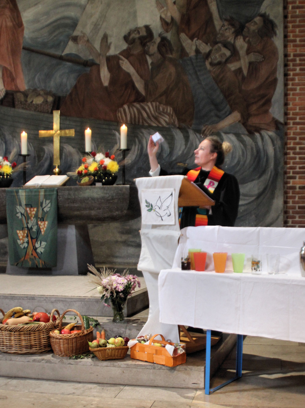 Weitere Höhepunkte des Gottesdienstes war der Auftritt der Kinder der evang. Kindertagesstätten in Unterschleißheim mit einem Erntetanz und die Präsentation eines Dankeswürfel, mit dem man sich Dinge erwürfeln kann, die glücklich machen.